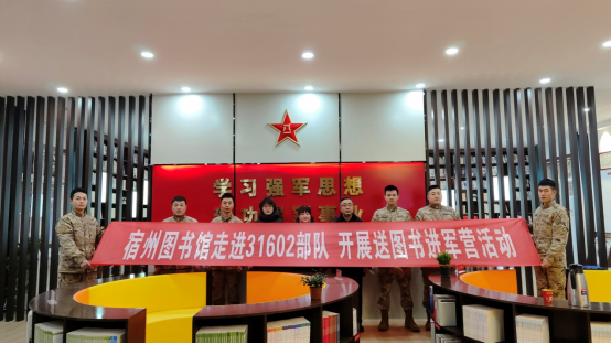2024年1月30日,在春节即将来临之际,为丰富部队官兵的精神文化生活,助力强军建设、促进军民融合发展,宿州图书馆走进31602部队开展送图书进军营活动,并建立了宿州图书馆中国人民解放军31602部队分馆,以此向部队官兵致以节日的问候和崇高的敬意。